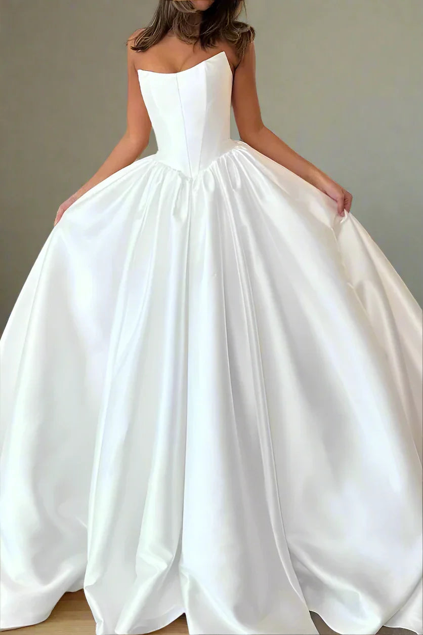 Style: Simple Neckline: V-neck Sleeve Length(cm): Short Wedding Dress Fabric: Satin Train: Chapel Train Origin: CN(Origin) For Pregnant Women: Yes Dresses Length: Floor-Length Back Design: Backless Item Type: Wedding Dresses Sleeve Style: Regular Built-in Bra: Yes is_customized: Yes Decoration: Pleat Fashion Element: simple Waistline: Natural Factors Silhouette: Ball Gown