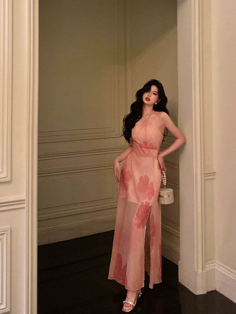 Stunning A line Halter Sleeveless Pink Floral Date Night Dress Prom Dresses Birthday Party Outfit SD854