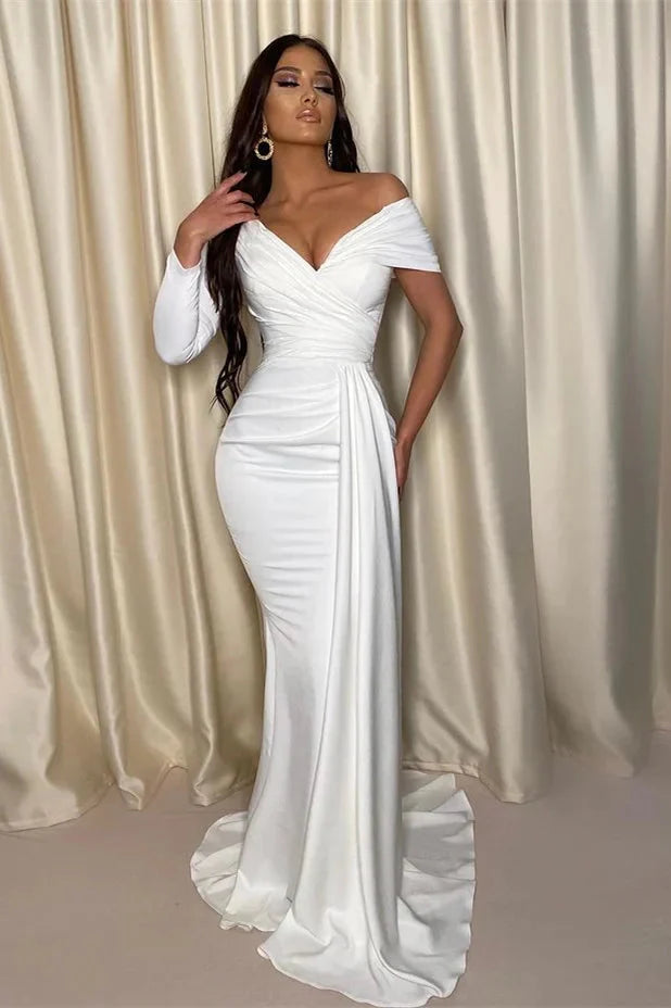 Stunning Long Sleeve Off-the-Shoulder White Evening Dress Mermaid Long With Pleats
