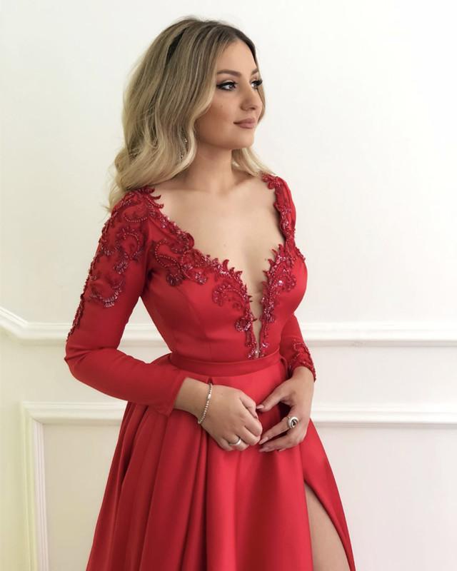 Item Descriptions:Classic Satin A-Line Long Sleeves Satin Dress with V-neck and Leg Slit. Zipper Back.Perfect as your Prom,Evening,Bridesmaid or any other special occasion dresses! Color Available In Red,Black,Burgundy,Royal-Blue,Navy-Blue