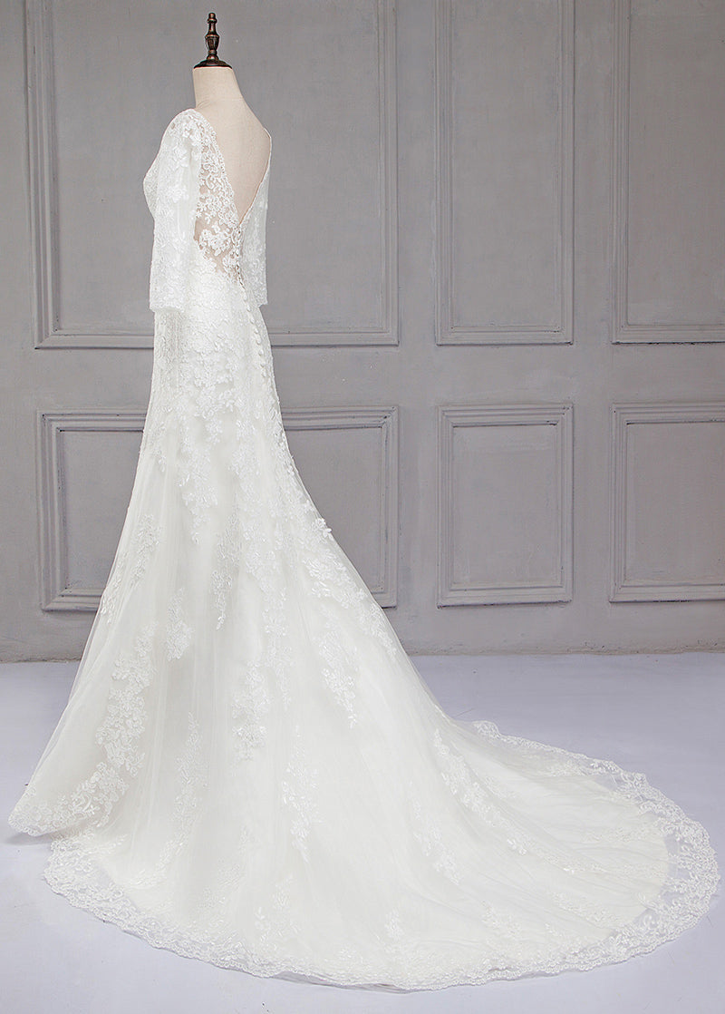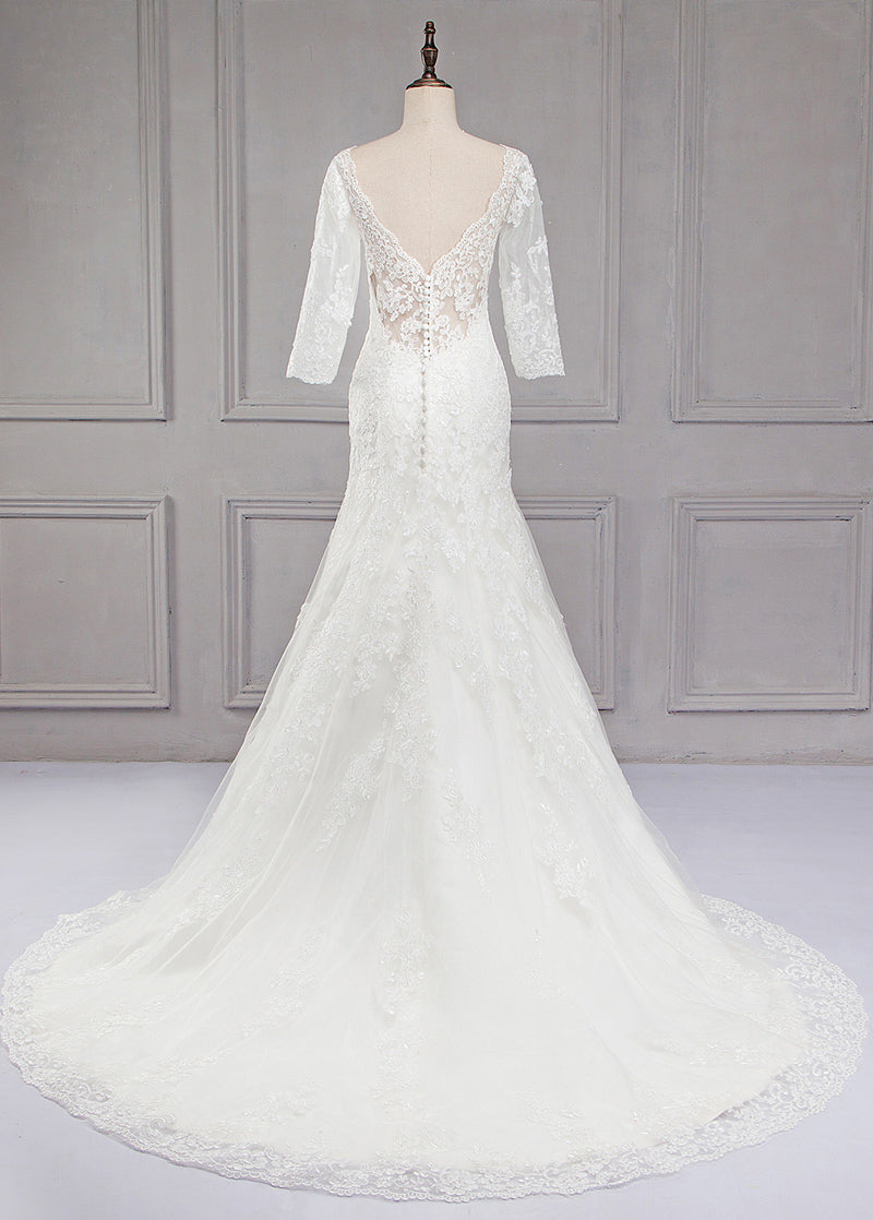 Sweep Train V-neck 3/4 Sleeves Lace Wedding Dresses