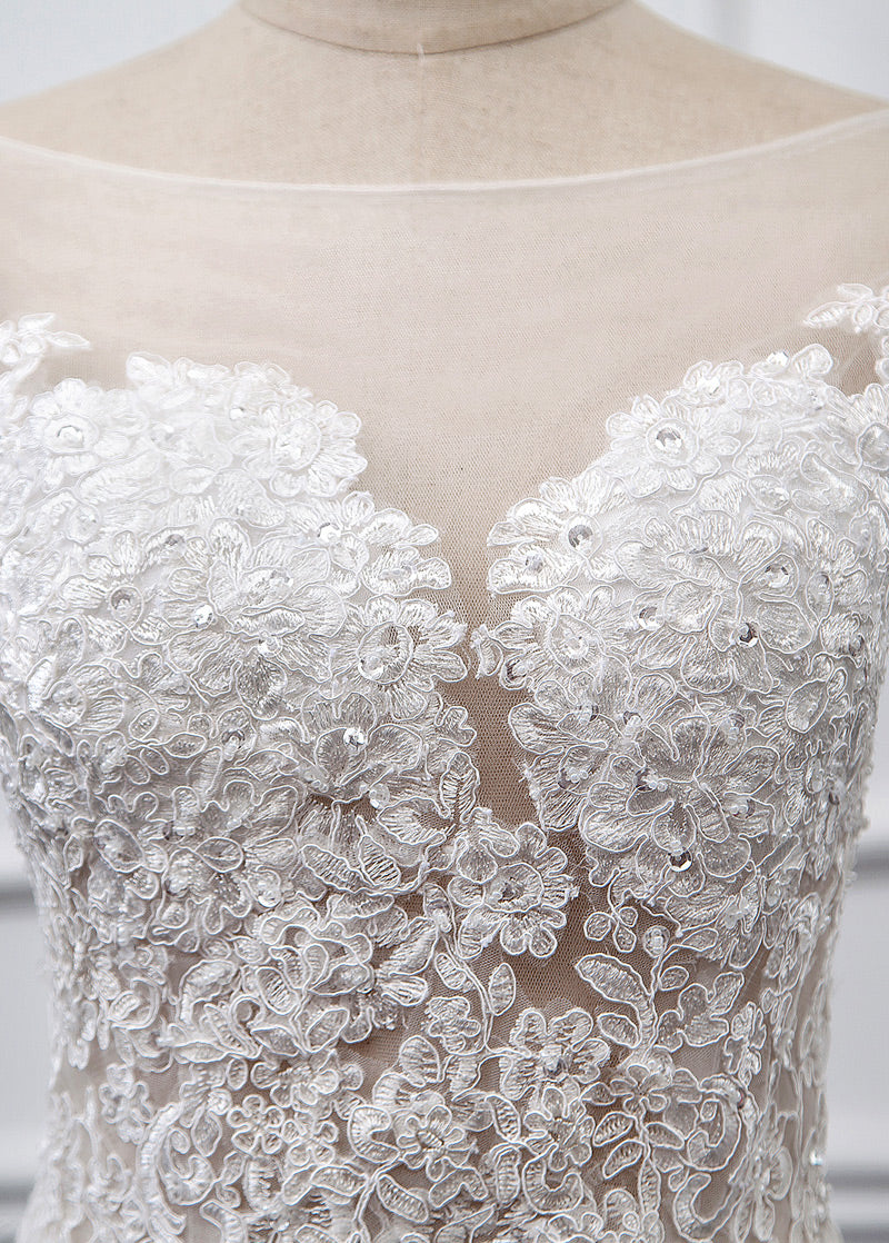 Silhouette: Princess, A-LineHemline / Train: Sweep / Brush TrainNeckline: Off ShoulderFabric: Tulle, LaceClosure: Zipper UPSleeve Length: Long SleeveWaistline: NaturalFully Lined: YesEmbellishment: AppliquesBuilt-In Bra: YesBoning: YesWedding Venues: ChurchTips: Professional dry cleaner only, Colors may vary slightly due to different monitor settingsTheme: Luxurious, RomanticWrap: No