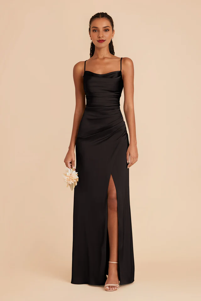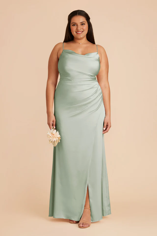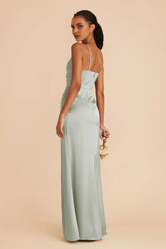 Thin shoulder strap pleated collar matte satin fish tail slit bridesmaid dress
