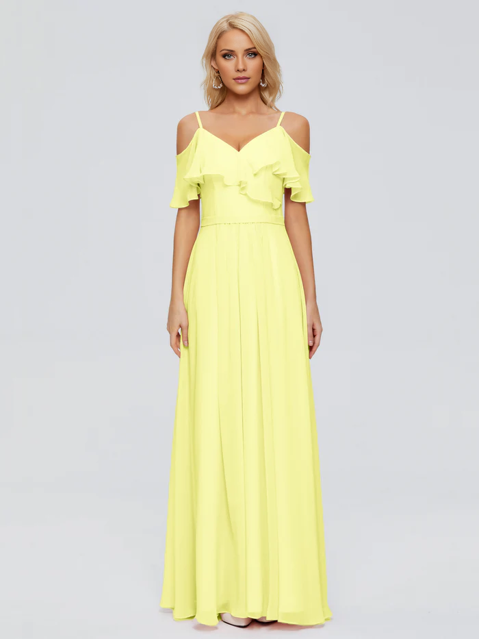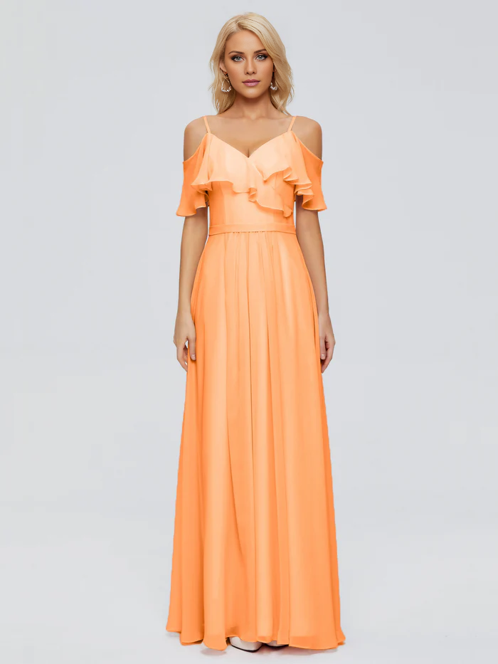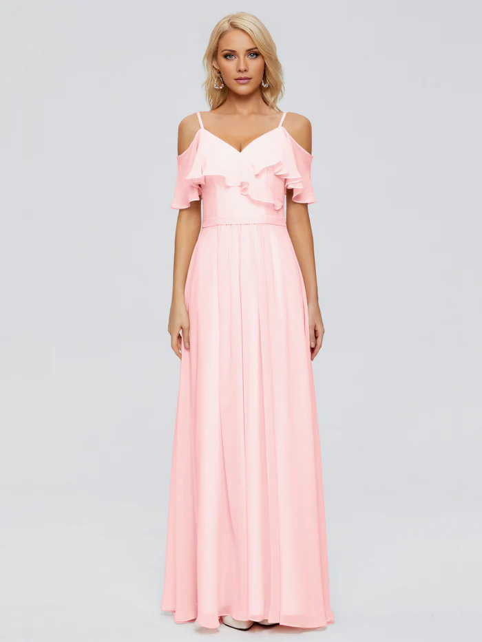 Thin shoulder strap ruffled chiffon and floor length bridesmaid dress