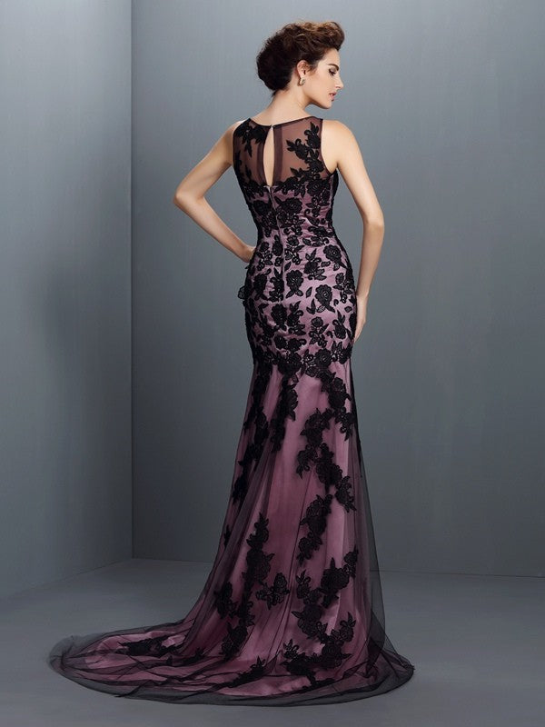 Trumpet/Mermaid Bateau Applique Sleeveless Long Woven Satin Dresses