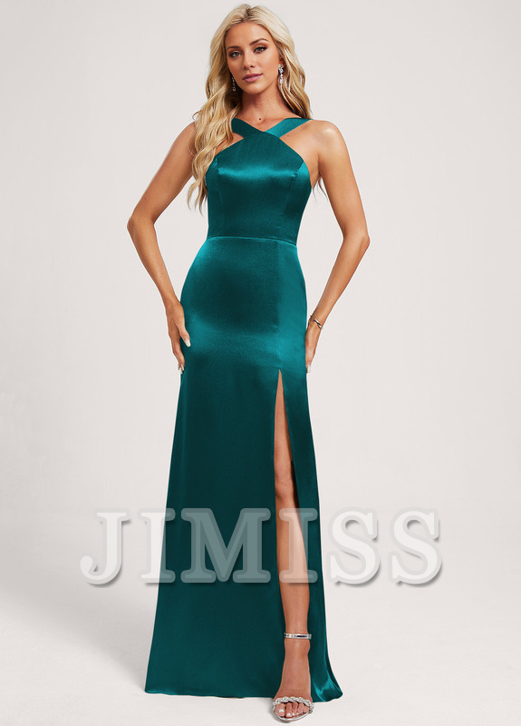 Trumpet/Mermaid Halter Neck Floor Length Satin Bridesmaid Dress