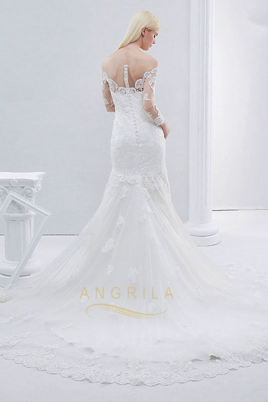 Silhouette: Princess, A-LineHemline / Train: Sweep / Brush TrainNeckline: Off ShoulderFabric: Tulle, LaceClosure: Zipper UPSleeve Length: Long SleeveWaistline: NaturalFully Lined: YesEmbellishment: AppliquesBuilt-In Bra: YesBoning: YesWedding Venues: ChurchTips: Professional dry cleaner only, Colors may vary slightly due to different monitor settingsTheme: Luxurious, RomanticWrap: No