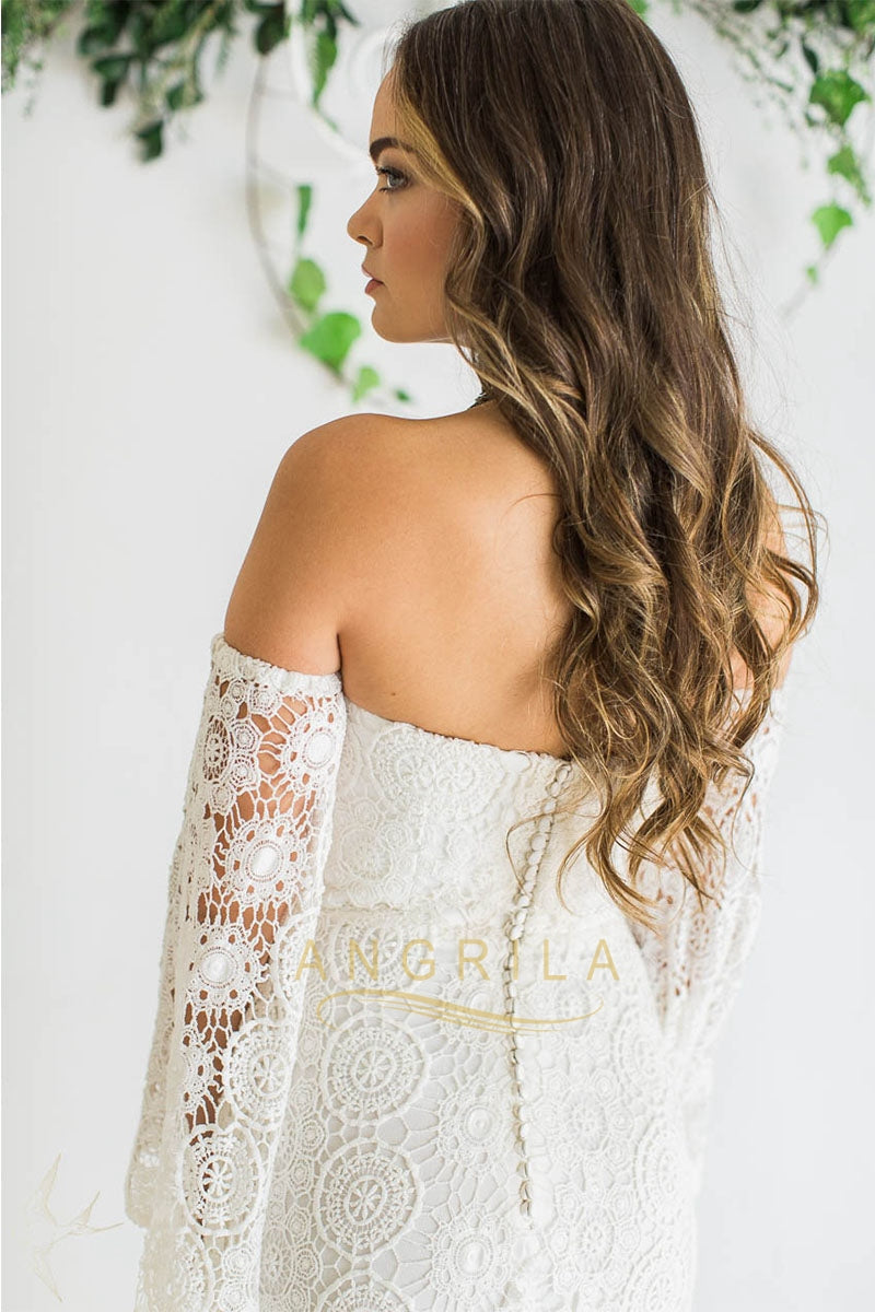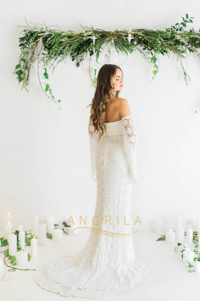 Silhouette: Princess, A-LineHemline / Train: Sweep / Brush TrainNeckline: Off ShoulderFabric: Tulle, LaceClosure: Zipper UPSleeve Length: Long SleeveWaistline: NaturalFully Lined: YesEmbellishment: AppliquesBuilt-In Bra: YesBoning: YesWedding Venues: ChurchTips: Professional dry cleaner only, Colors may vary slightly due to different monitor settingsTheme: Luxurious, RomanticWrap: No