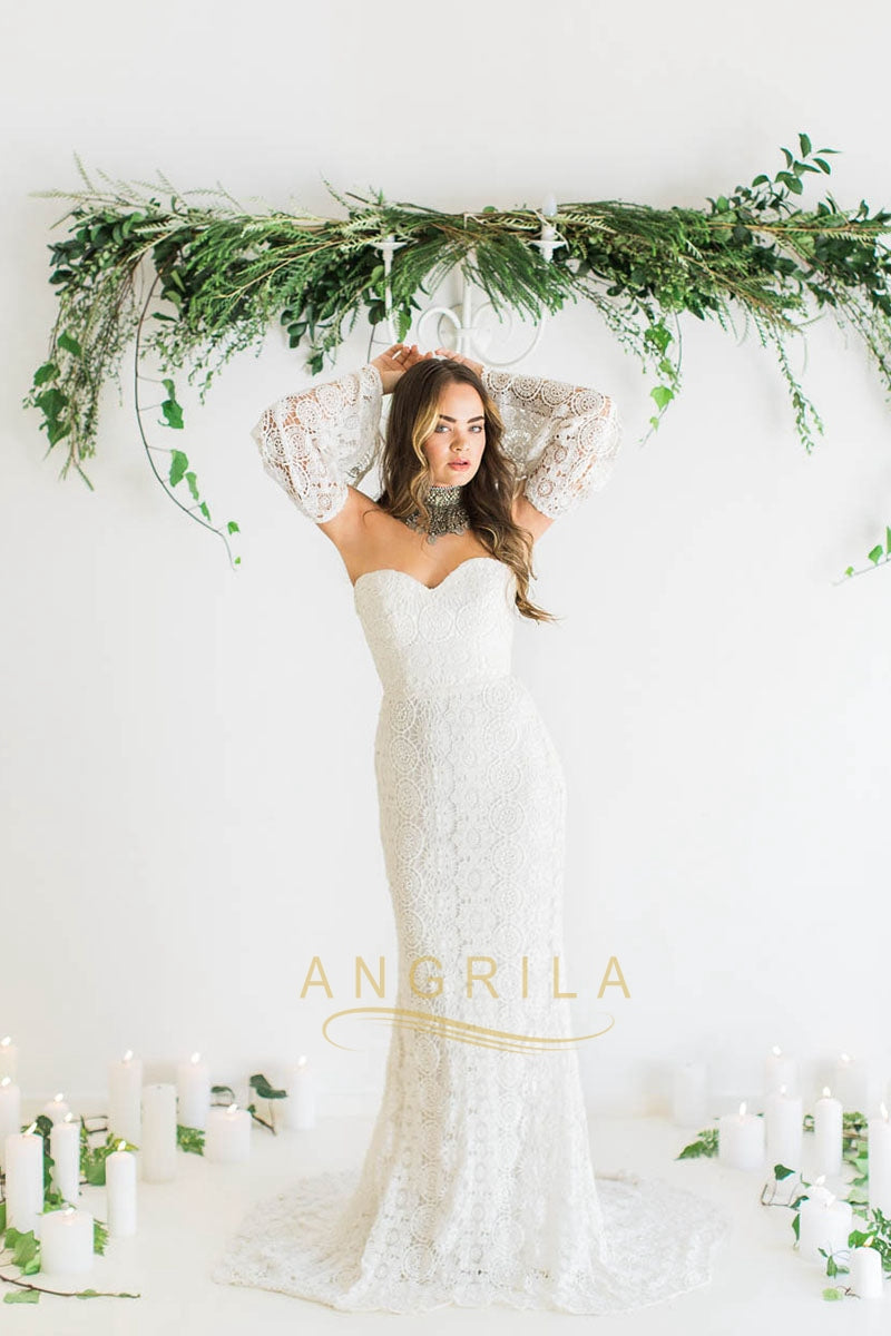 Sweetheart Sweep Train Lace Wedding Dress with Sleeves