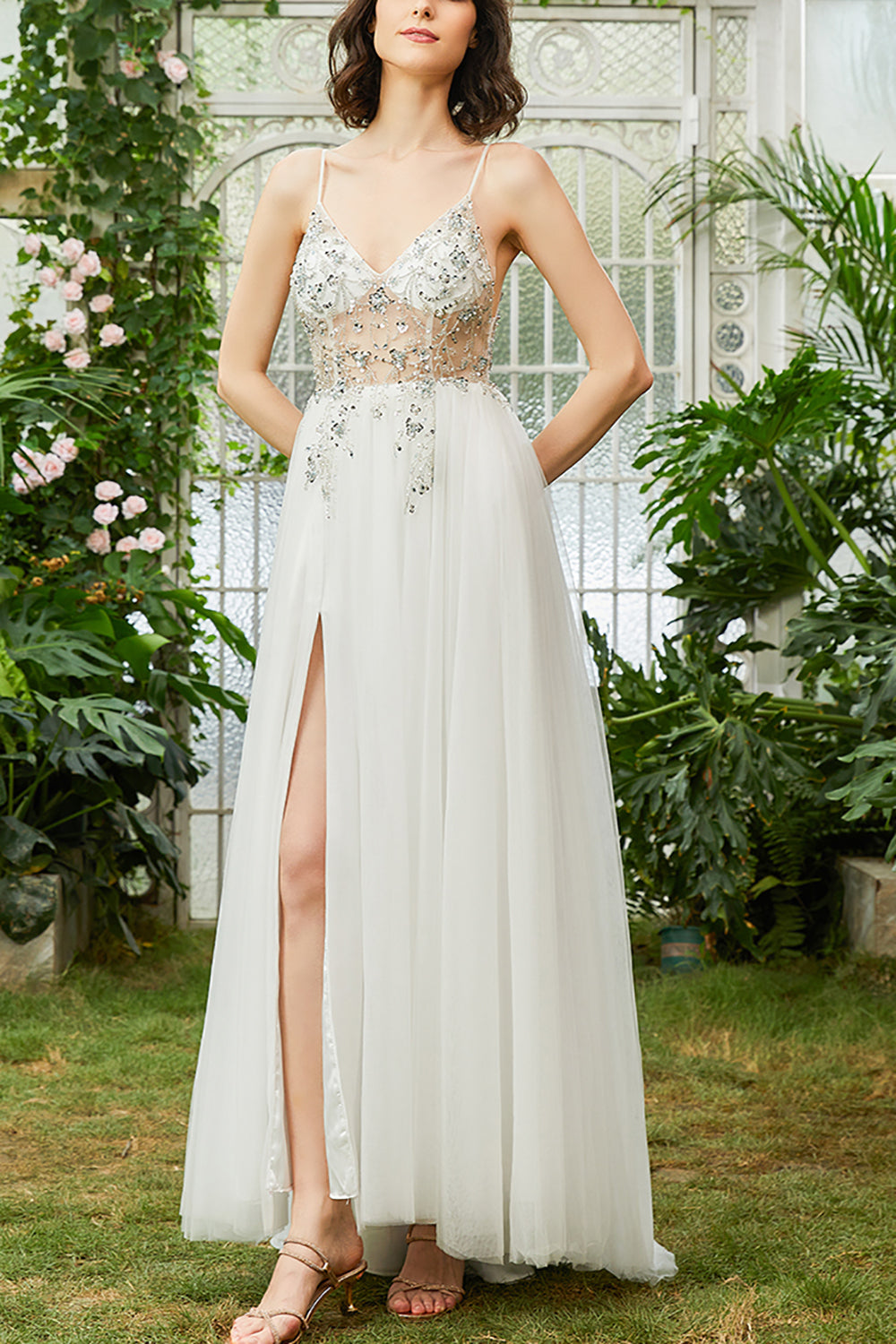 Tulle Spaghetti Straps White Long Prom Dress with Beading