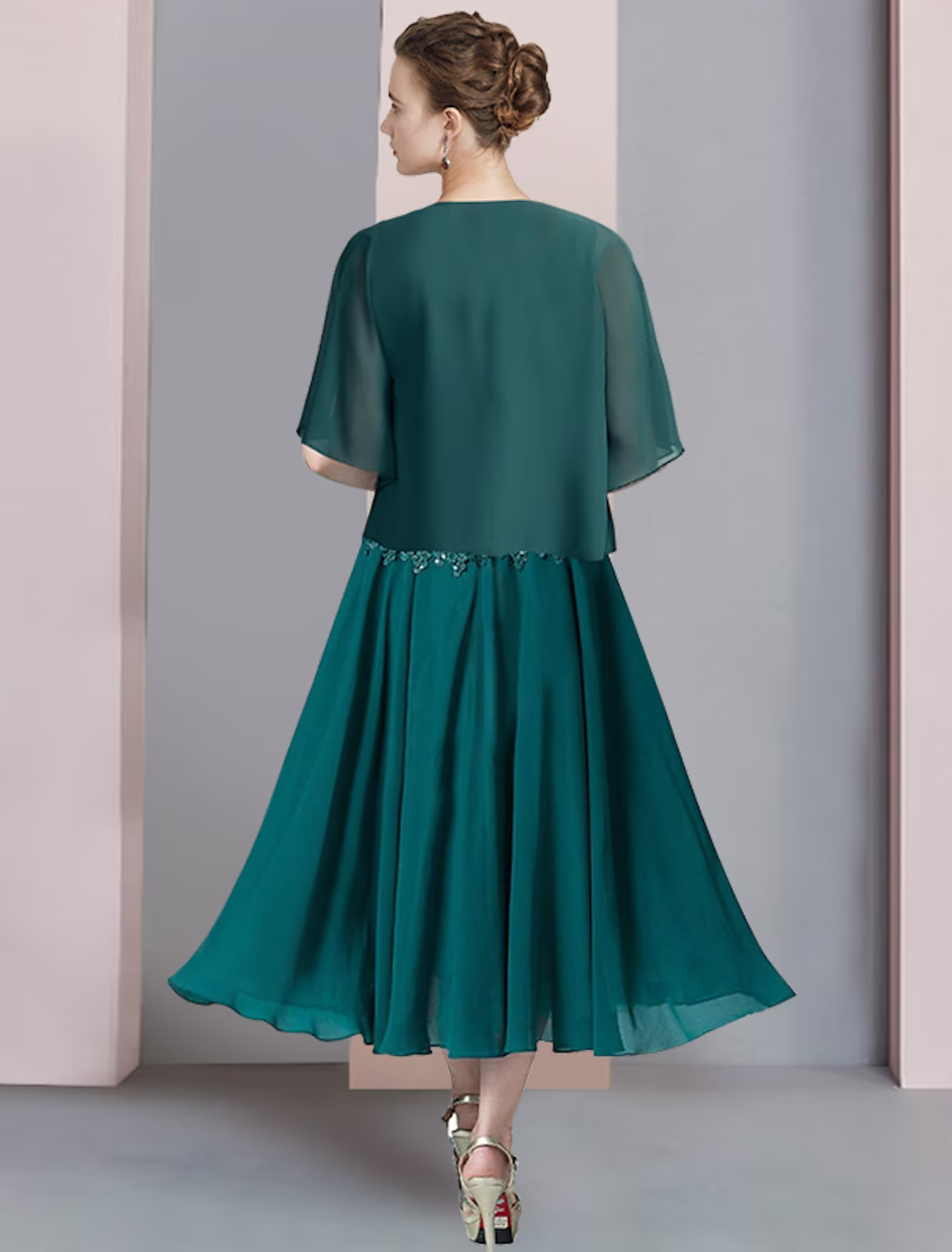 Two Piece A-Line Mother of the Bride Dress Formal Wedding Guest Elegant V Neck Chiffon Lace Short Sleeve Wrap Included with Sequin Appliques