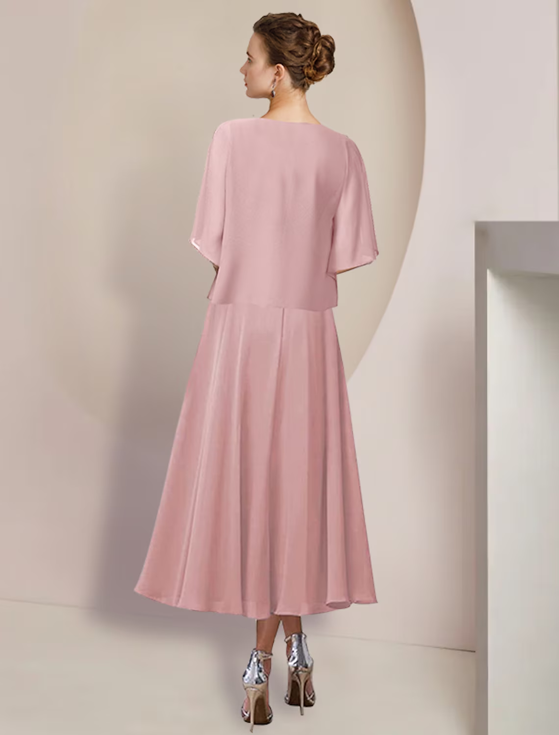 Two Piece A-Line Mother of the Bride Dress Formal Wedding Guest Elegant V Neck Chiffon Lace Sleeve Wrap Included with Appliques