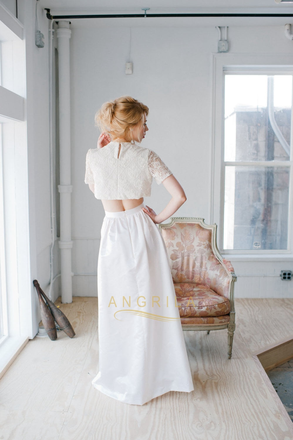 Two-Piece Lace Bodice Satin Wedding Dresses with Short Sleeves