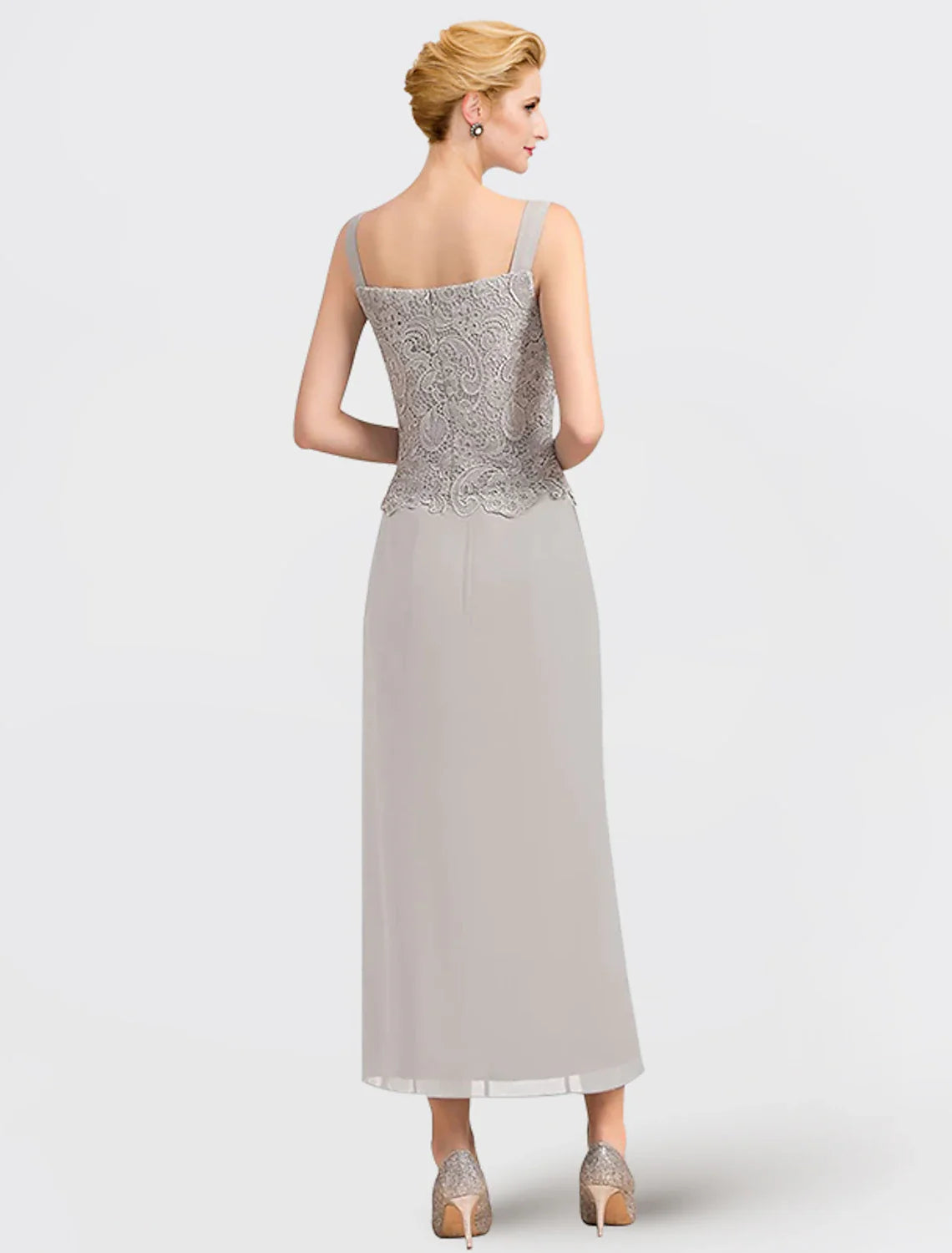 Two Piece Mother of the Bride Dress Formal Wedding Guest Elegant Square Neck Ankle Length Chiffon Lace Sleeveless Wrap Included with Appliques