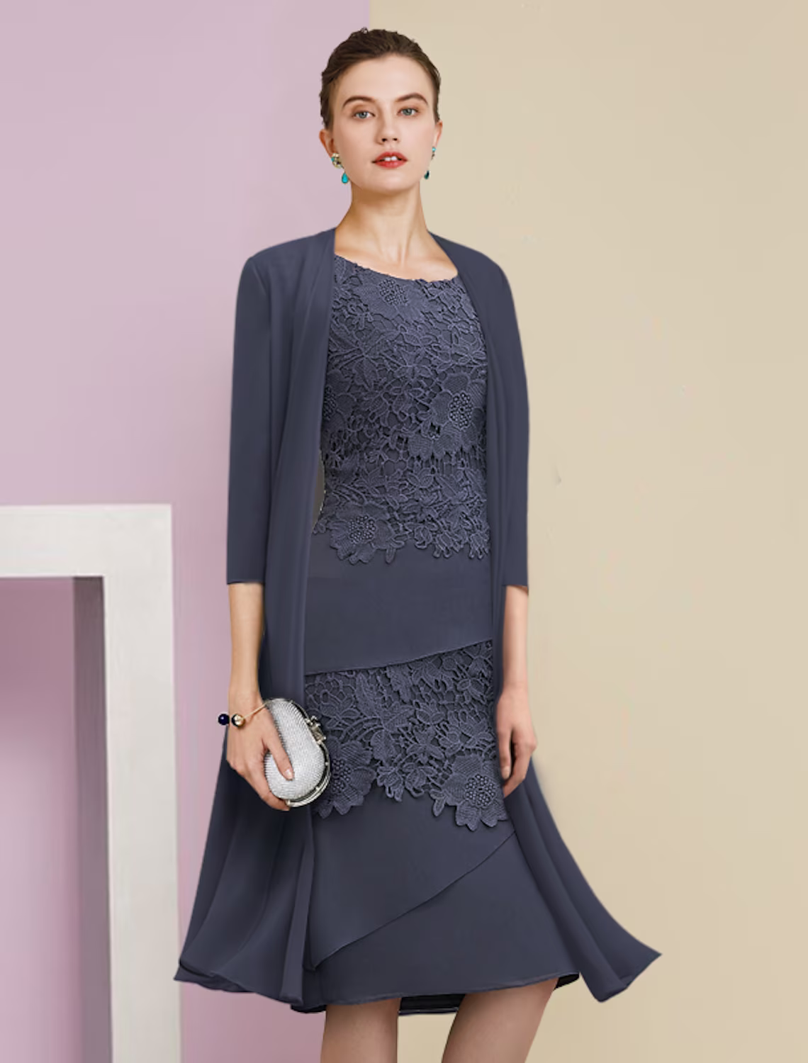 Two Piece Mother of the Bride Dress Formal Wedding Guest Vintage Elegant Scoop Neck Knee Length Chiffon Lace Short Sleeve Jacket Dresses with Tier Appliques