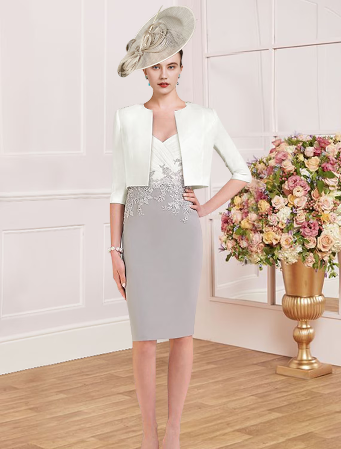 Two Piece Mother of the Bride Dress Wedding Guest Elegant V Neck Knee Length Stretch Fabric Half Sleeve with Appliques