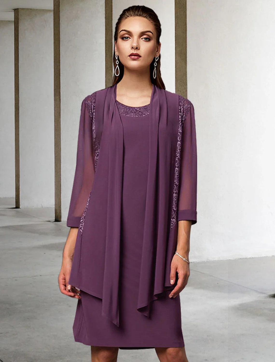 Two Piece Sheath / Column Mother of the Bride Dress Elegant Jewel Neck Knee Length Chiffon Lace Sleeveless Jacket Dresses with Solid Color