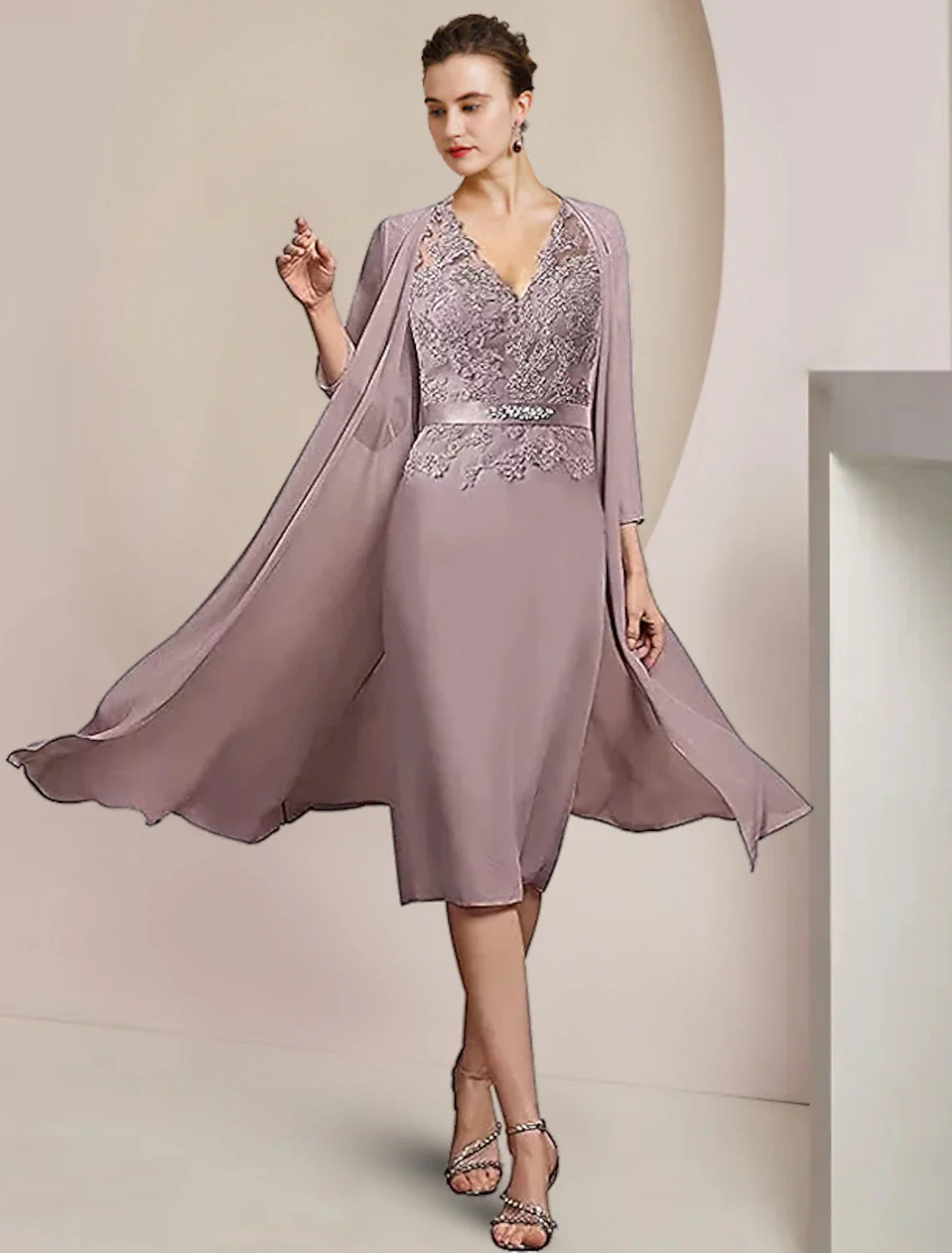Two Piece Sheath / Column Mother of the Bride Dress Formal Wedding Guest Elegant V Neck Knee Length Chiffon Lace Sleeveless Jacket Dresses with Appliques Crystal Brooch