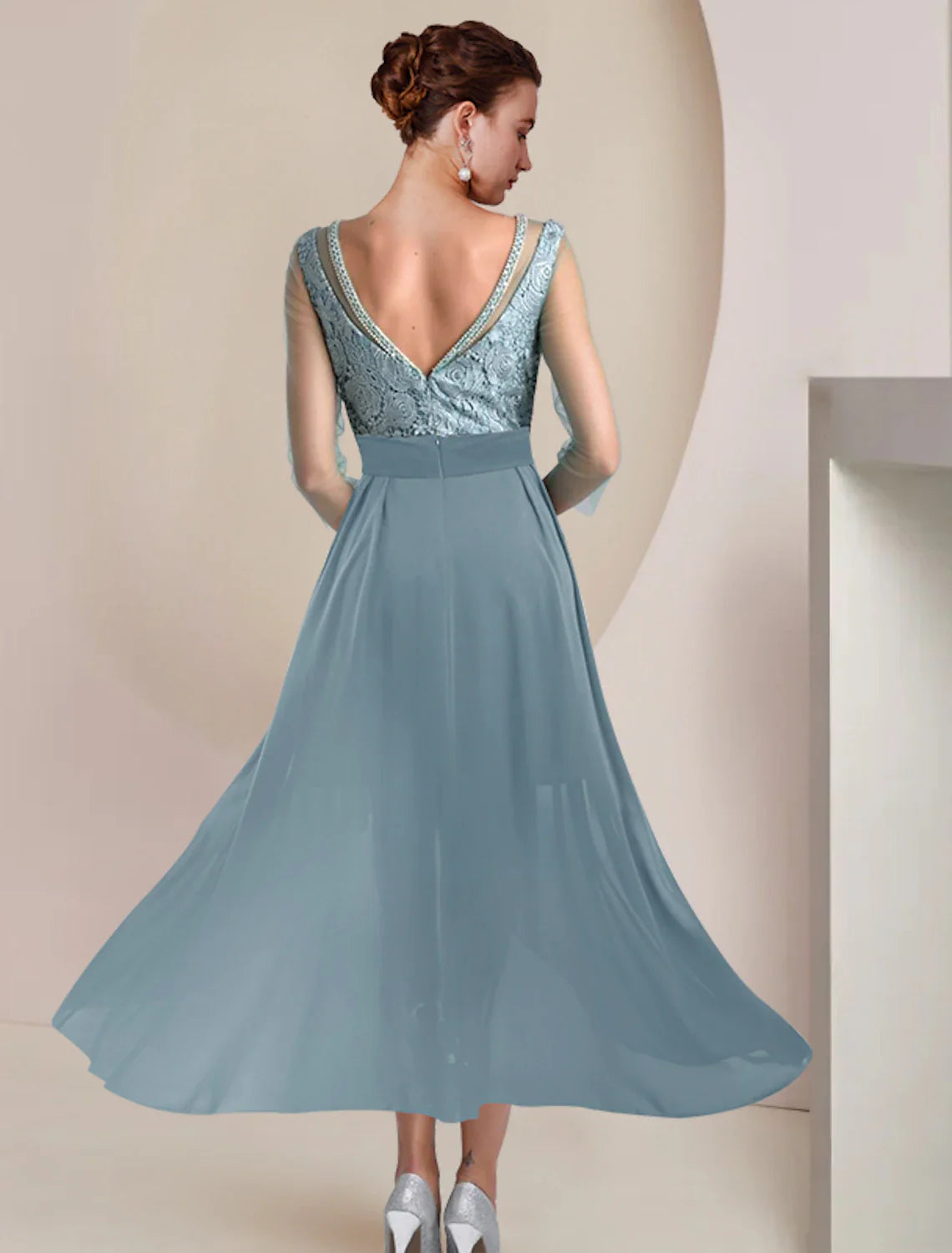 Two Piece Sheath / Column Mother of the Bride Dress Formal Wedding Guest Vintage Elegant Jewel Neck Tea Length Knee Length Chiffon Lace 3/4 Length Sleeve with Beading Appliques