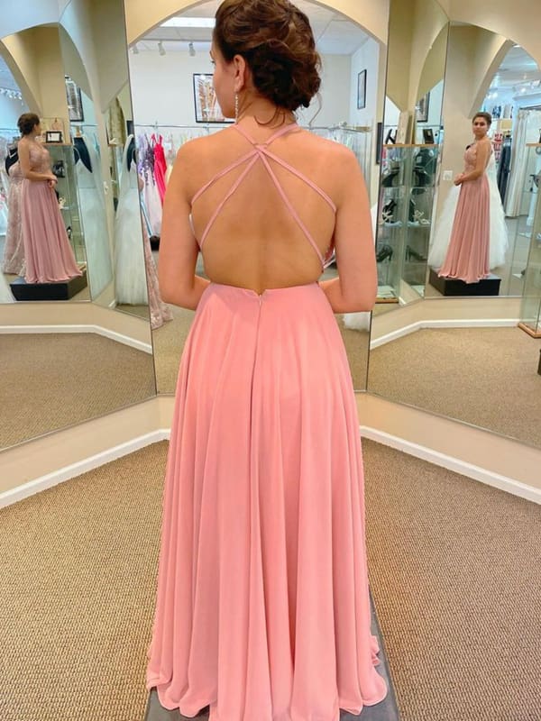 V Neck Backless Pink Lace Long Prom Dresses with Slit, Pink Lace Tulle Bridesmaid Dresses, Pink Formal Graduation Evening Dresses
