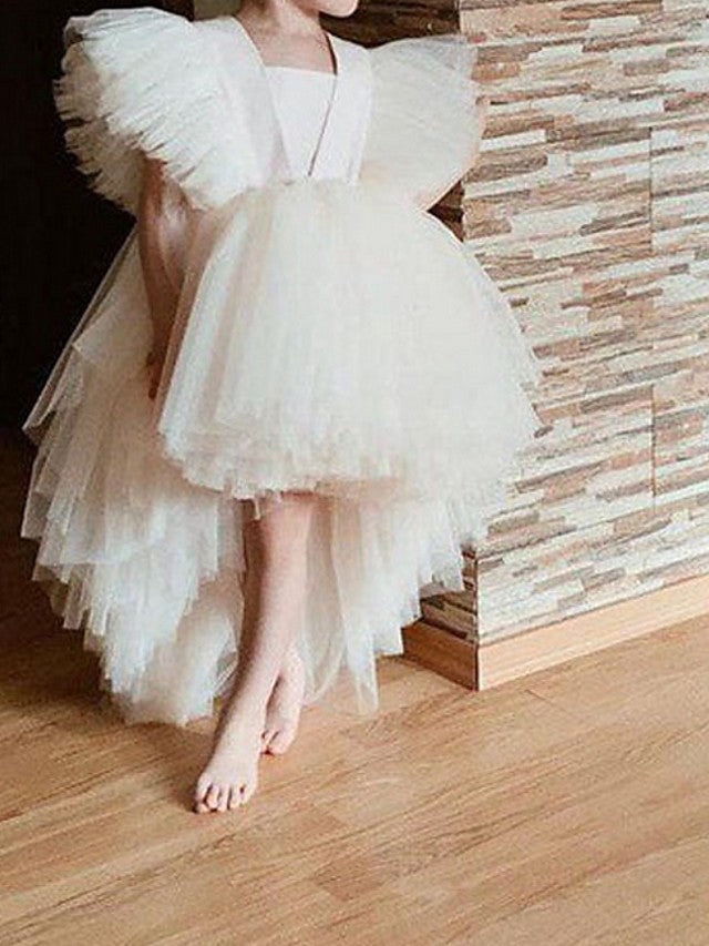 V Neck Ball Gown Knee Length Flower Girl Dress with Tulle and Tier Appliques