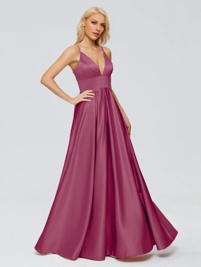 V-neck thin shoulder strap satin and floor length bridesmaid dress