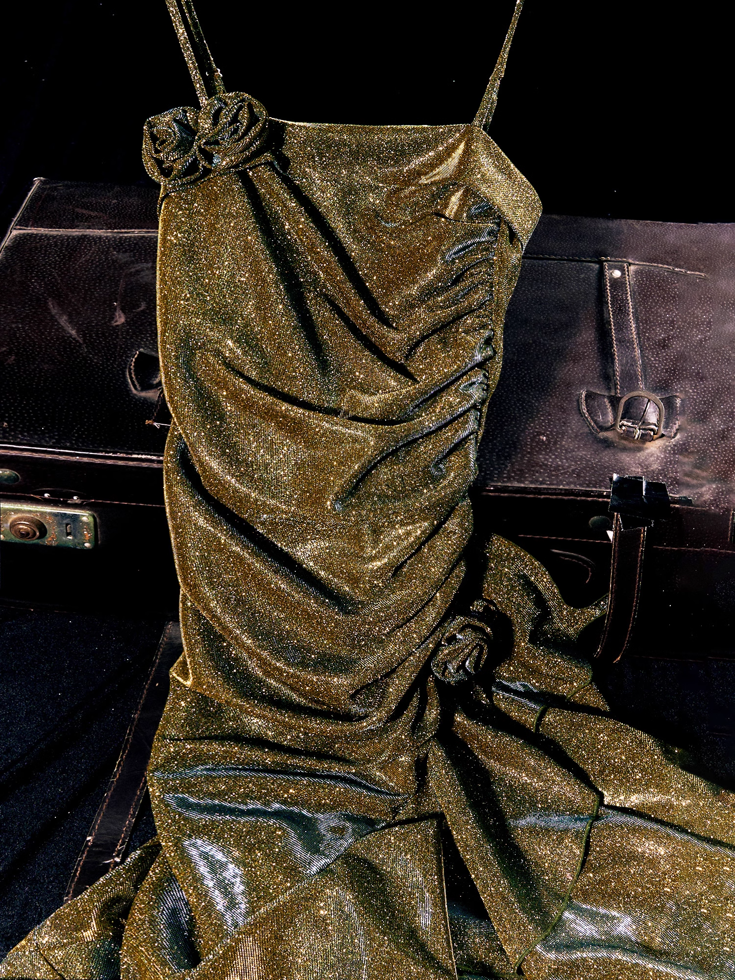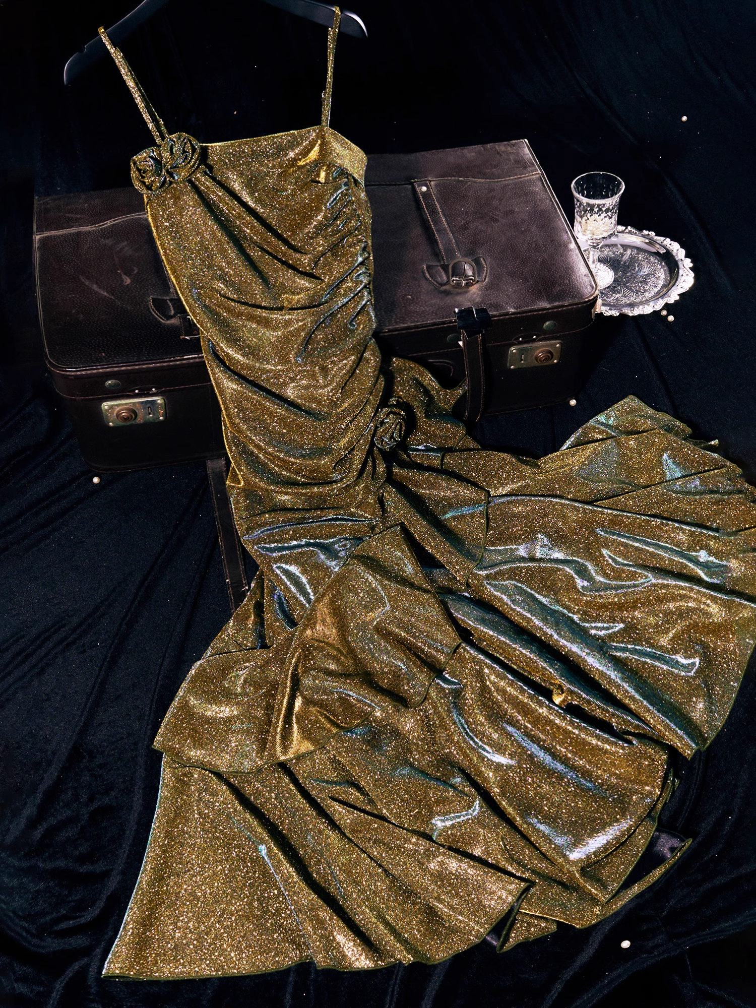 Vintage Mermaid Spaghetti Straps Long Gold Sequin Prom Dresses Birthday Outfits With Flowers SD485