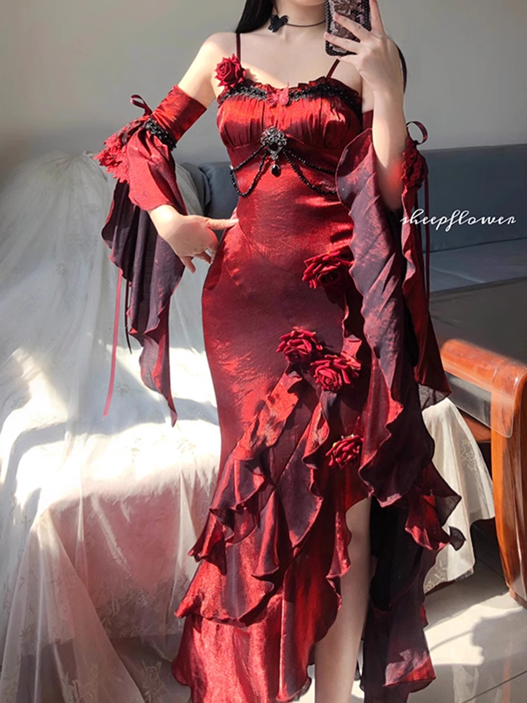 Vintage High Low Spaghetti Straps Floor Length Burgundy Flowers Prom Dresses Birthday Dress SD463