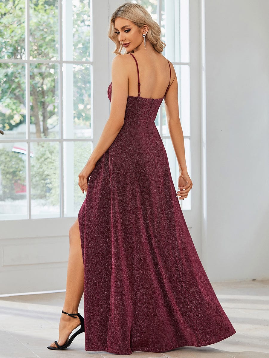 Weitese Spaghetti Strap Front Slit Shiny Evening Dress