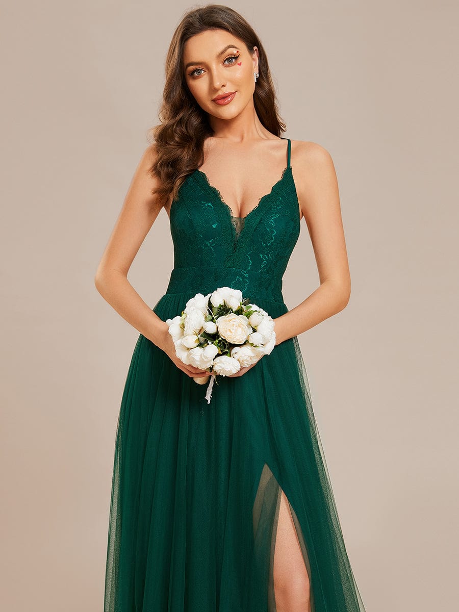 Weitese Spaghetti Straps Cross-Back Lace Top A-Line High Slit Tulle Bridesmaid Dress