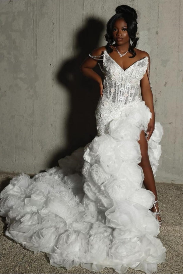 This White Sweetheart Sheath Organza Side Slit Prom Dress is designed with delicate flowers, adding a romantic touch to the elegant sweetheart neckline and mermaid silhouette. The sleeveless design and side slit provide a sexy and lively look, while the organza material and court train add a luxurious feel. Perfect for a special evening or prom.