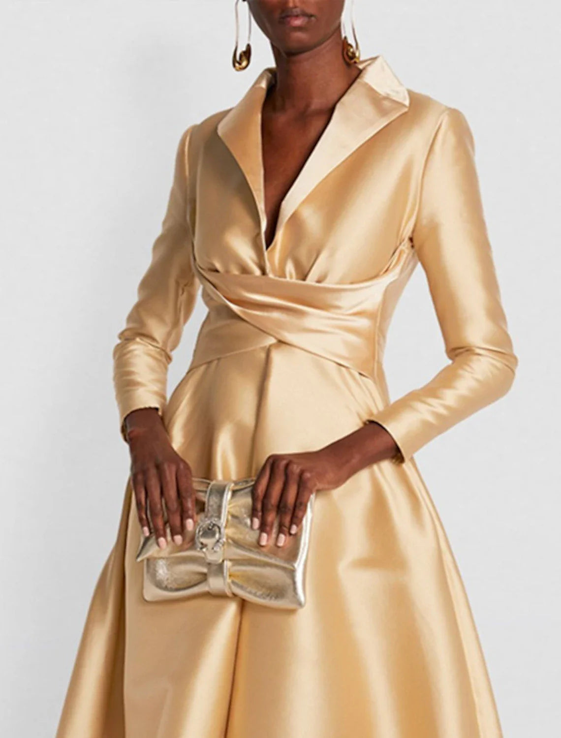 Wholesa A-Line Evening Gown Elegant Red Green Dress Formal Wedding Guest Floor Length Long Sleeve Shirt Collar Satin with Ruched