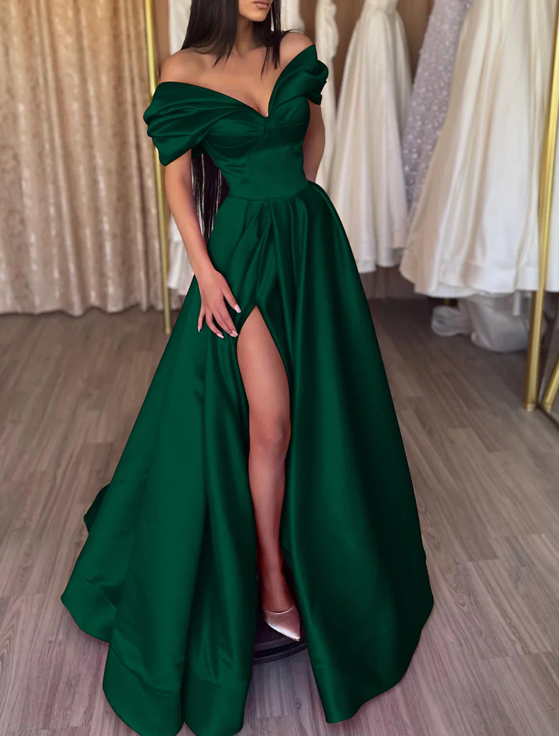 A-Line Evening Gown Party Dress Sexy Dress Prom Birthday Floor Length Short Sleeve Off Shoulder Satin with Slit Pure Color