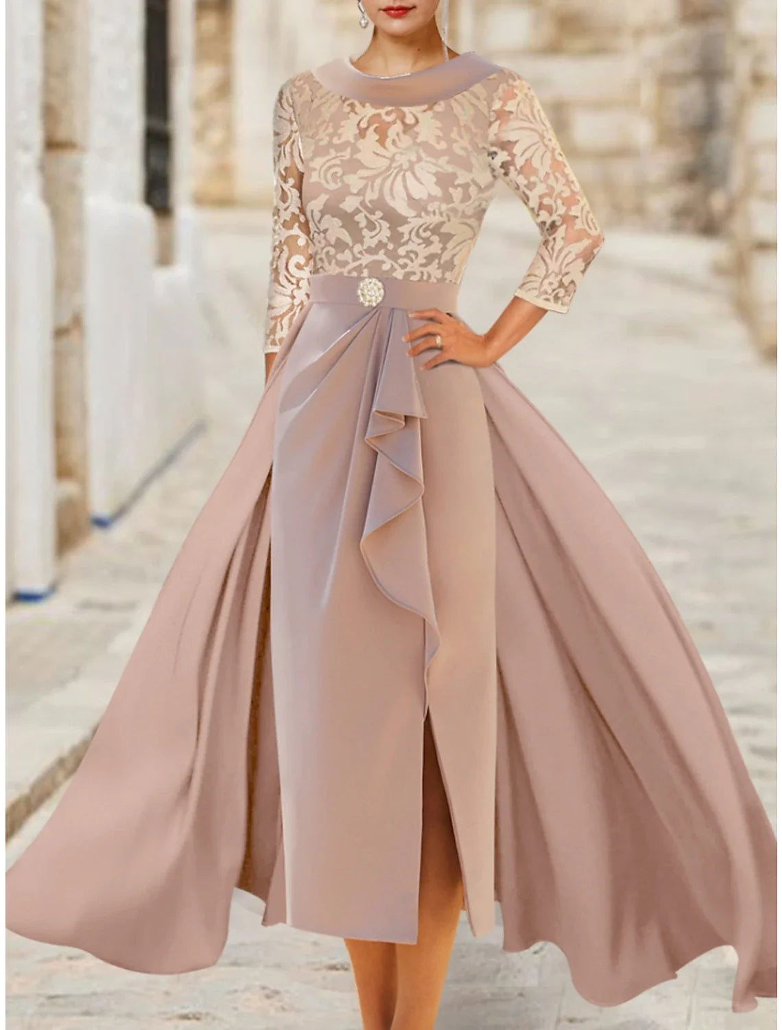 A-Line Mother of the Bride Dress Wedding Guest Elegant Scoop Neck Ankle Length Satin Lace 3/4 Length Sleeve with Ruffles Split Front Ruching