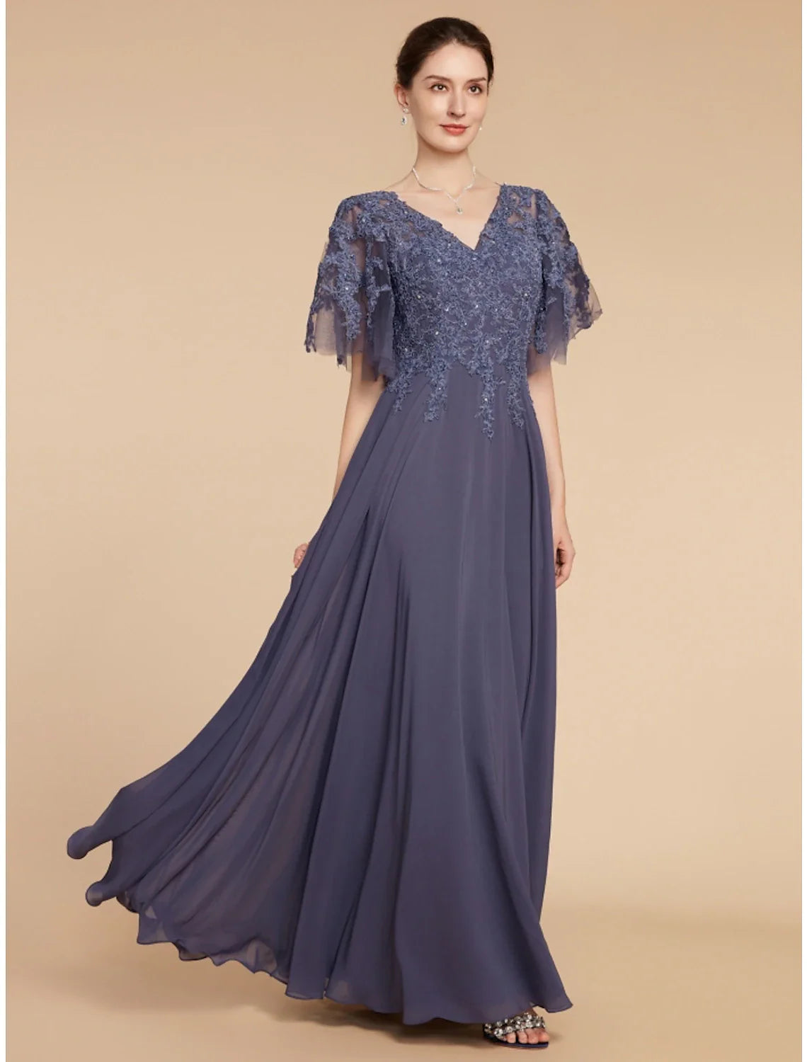 A-Line Mother of the Bride Dress Wedding Guest Elegant V Neck Floor Length Chiffon Lace Short Sleeve with Sequin Ruching Solid Color