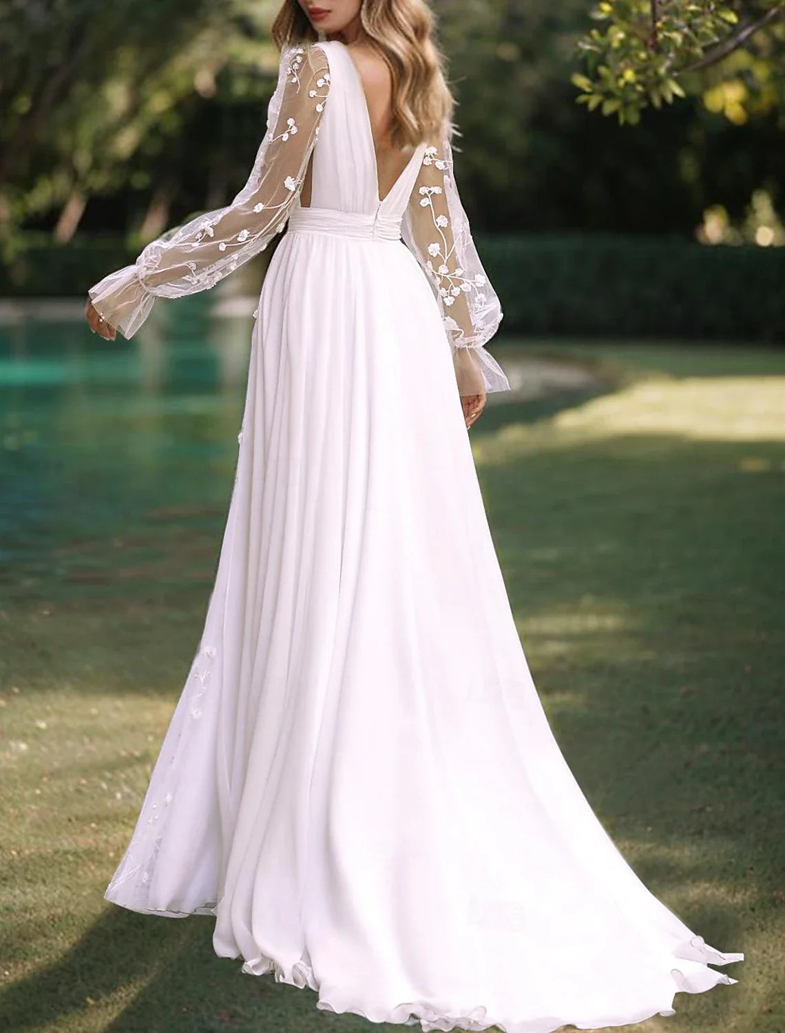 Beach Wedding Dresses A-Line V Neck Long Sleeve Floor Length Chiffon Bridal Gowns With Solid Color