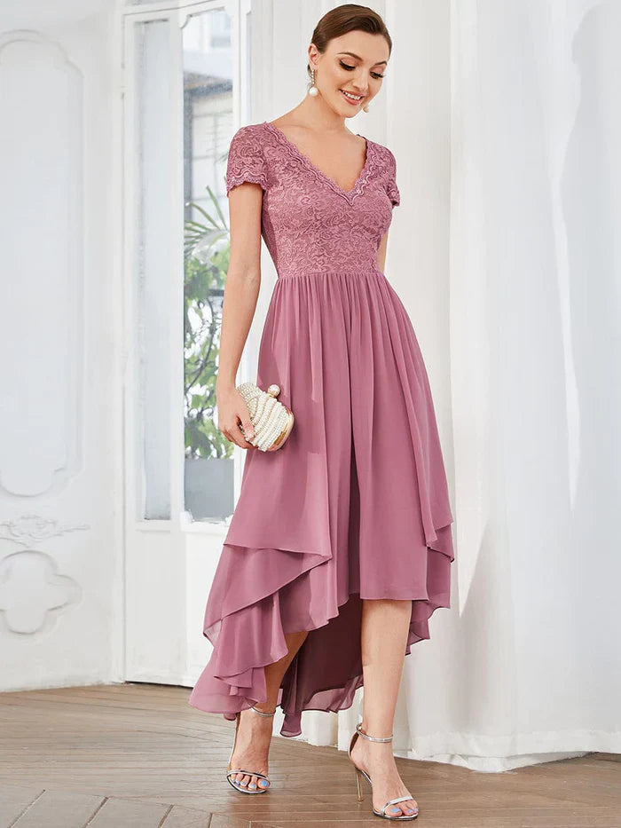 Brief Sleeve Vintage Ribbons Short Sleeve Higher Low Mother of the Bride Gown