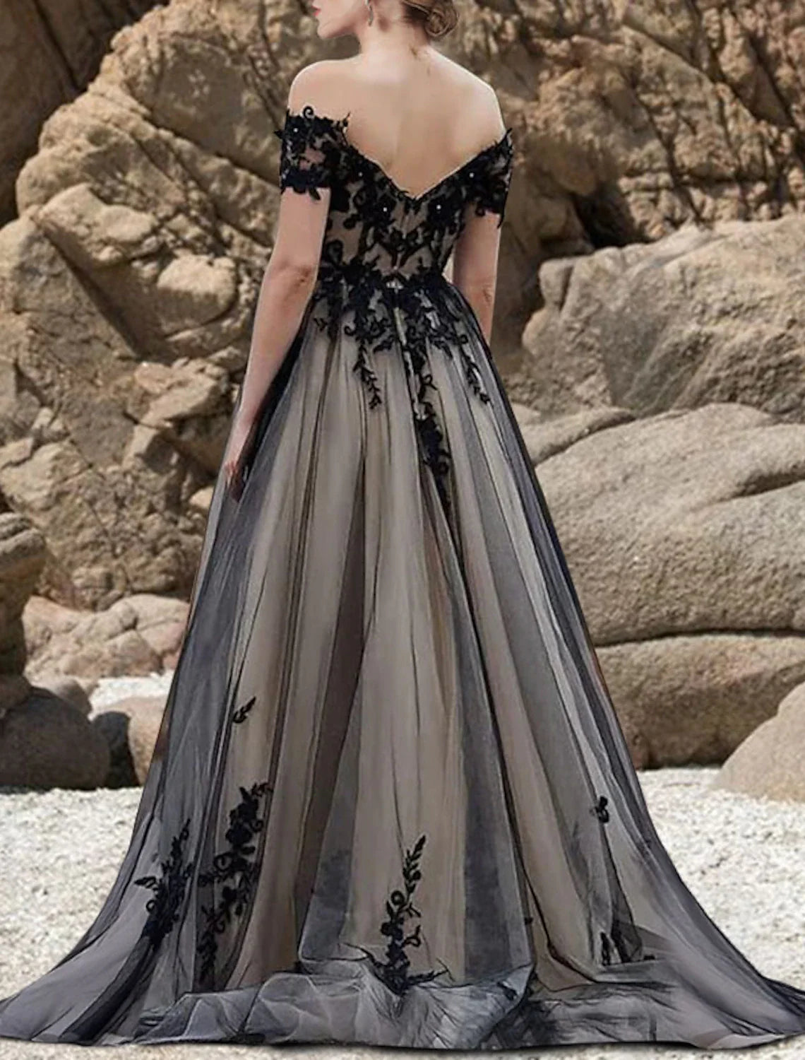 Engagement Gothic Wedding Dresses in Color Formal Wedding Dresses A-Line Off Shoulder Short Sleeve Sweep / Brush Train Lace Bridal Gowns With Bow(s) Appliques