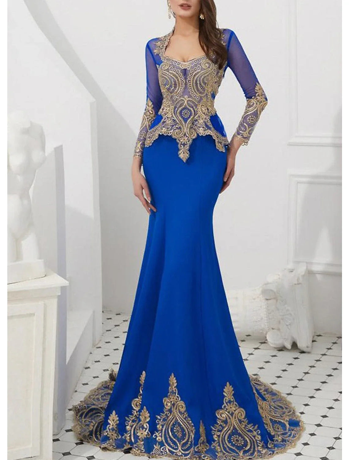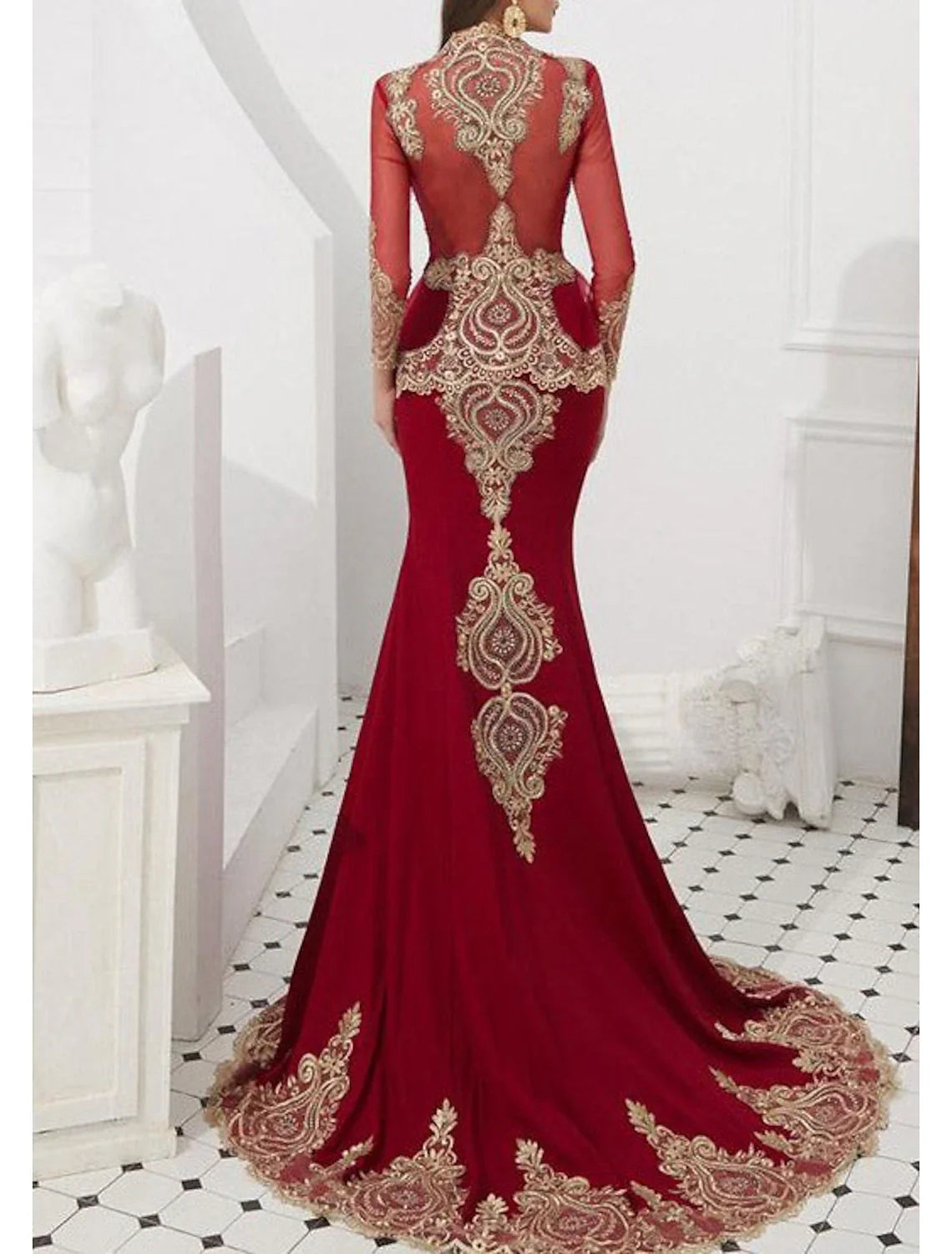 Mermaid Black Dress Evening Gown Black Dress Vintage Halloween Engagement Court Train Long Sleeve High Neck Wednesday Addams Family Satin with Appliques