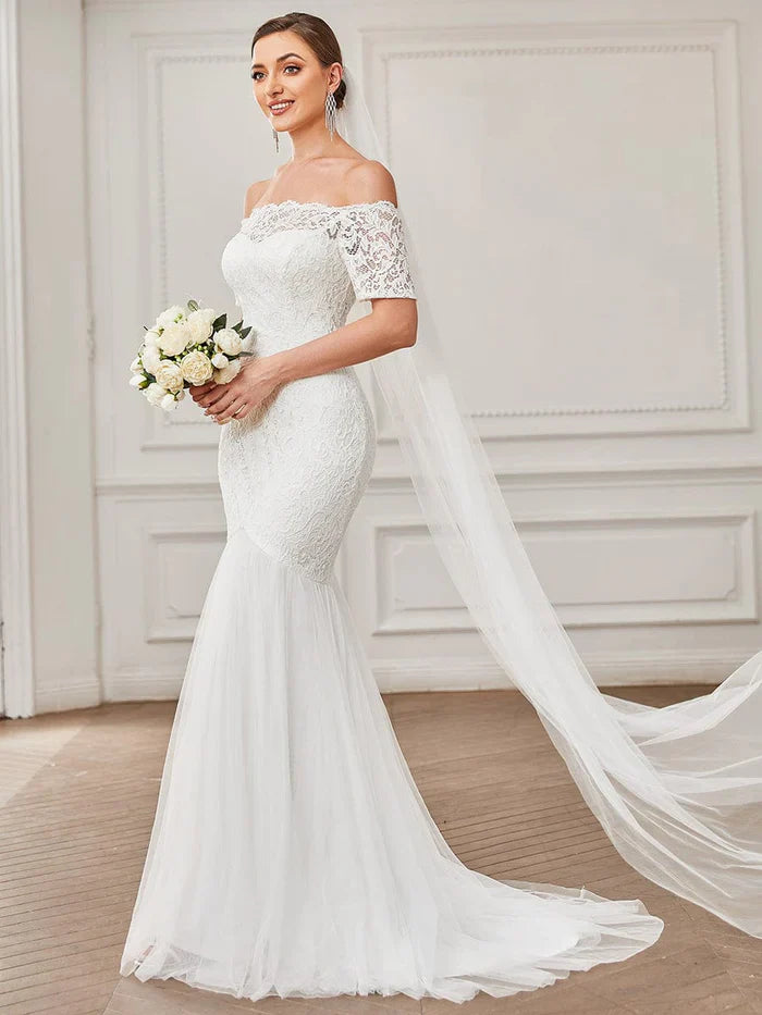 Aimishang Off the Shoulder Bodycon Fishtail Vintage Embroidered Floral Lace Wedding Dress