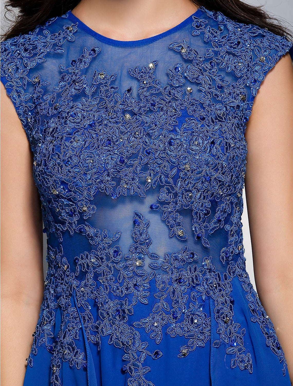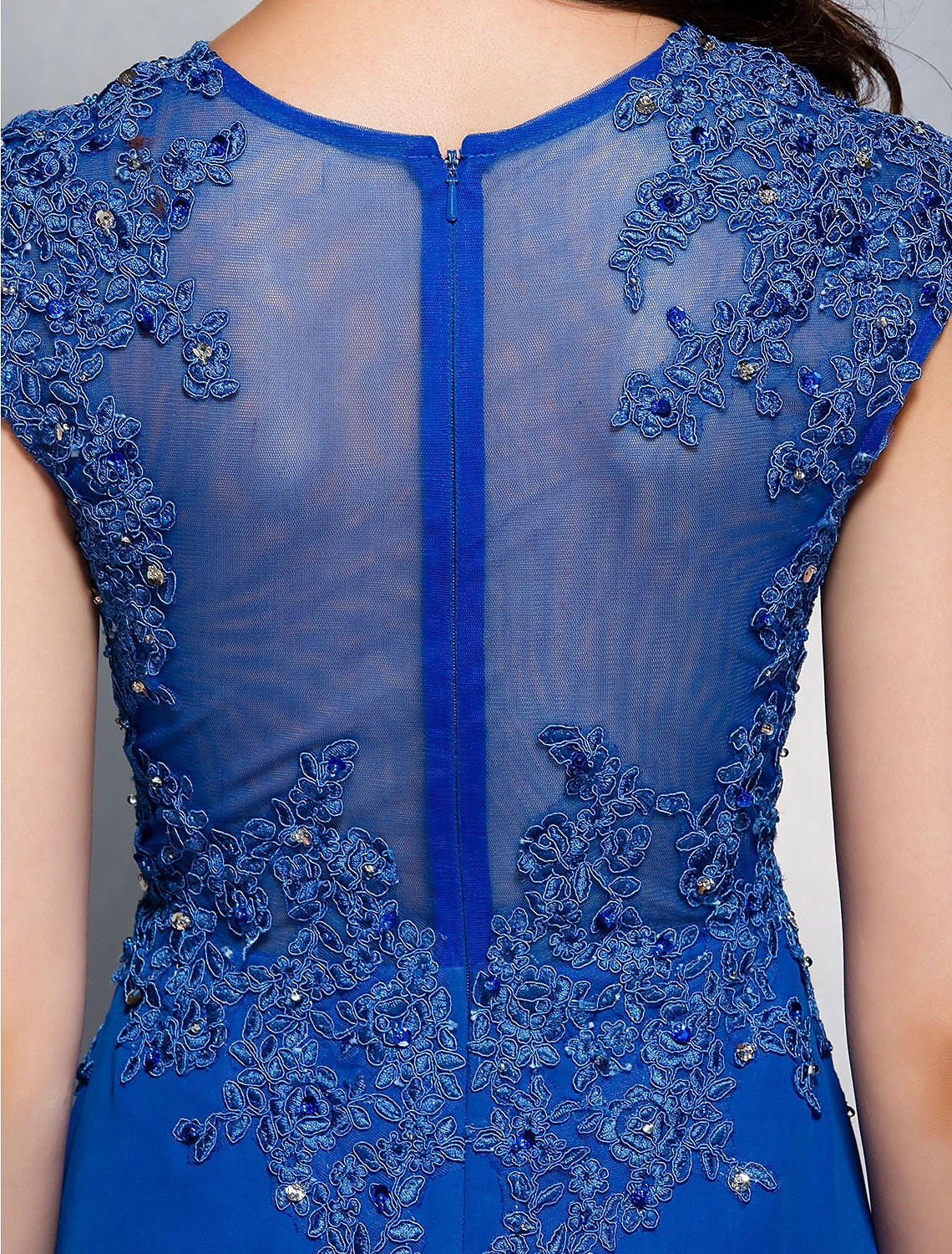 Wholesa Sheath / Column Elegant Floral Formal Evening Wedding Party Dress Illusion Neck Short Sleeve Sweep / Brush Train Chiffon with Appliques