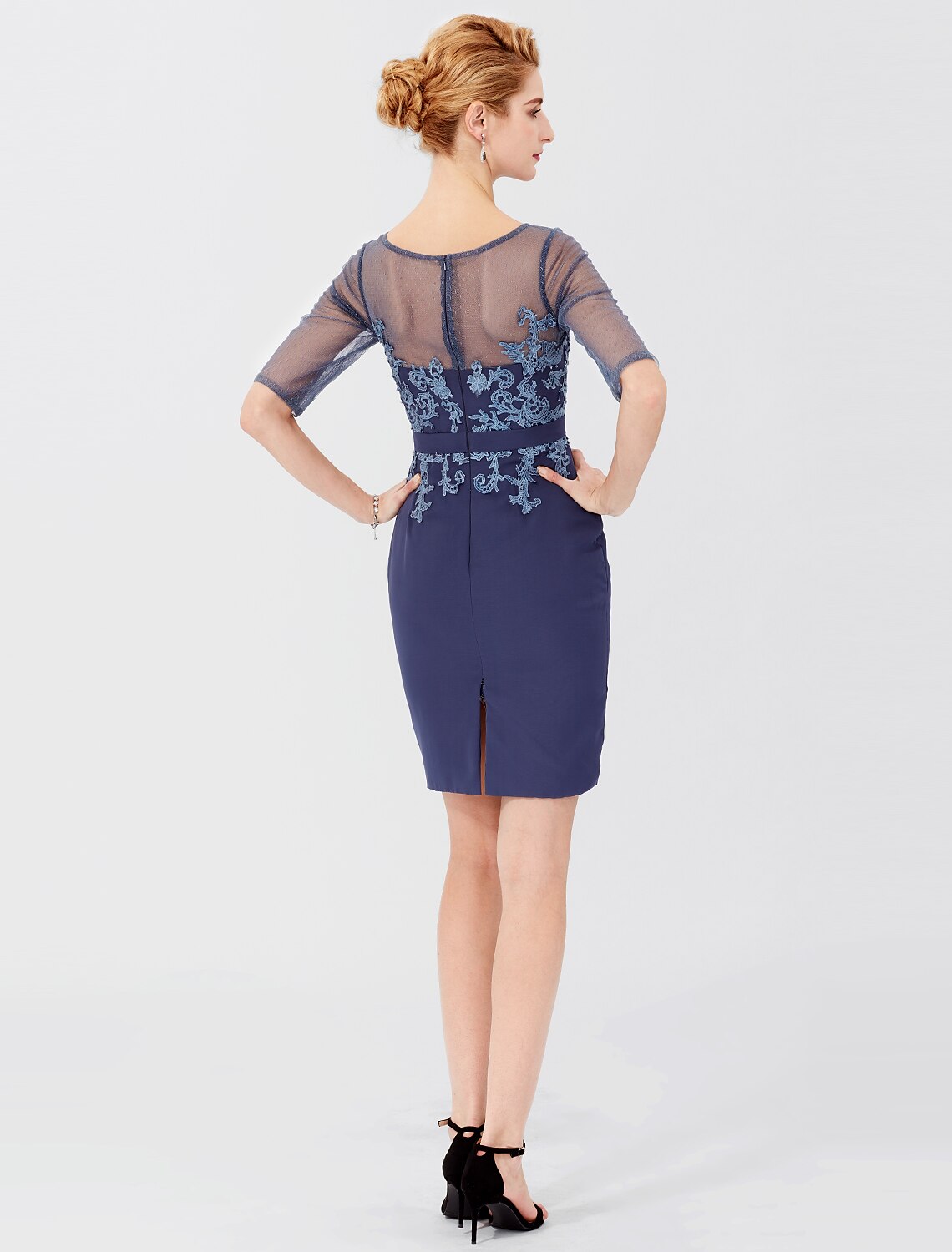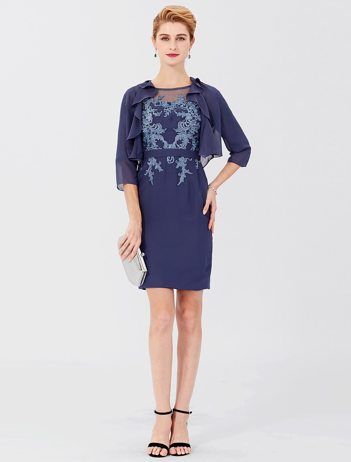 Style: ElegantSilhouette: Sheath / ColumnHemline / Train: Knee LengthNeckline: Jewel NeckFabric: SatinClosure: Zipper UPSleeve Length: Short SleeveEmbellishment: AppliquesTips: Colors may vary slightly due to different monitor settings, Hand Wash OnlyWrap: No