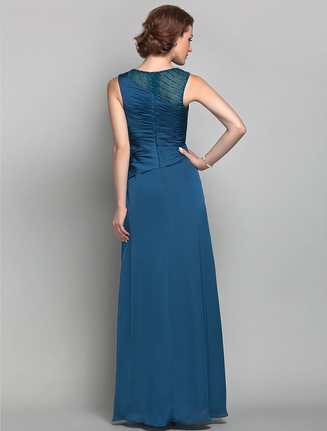 Sheath / Column Mother of the Bride Dress Vintage Inspired Jewel Neck Floor Length Satin Chiffon Sleeveless with Beading