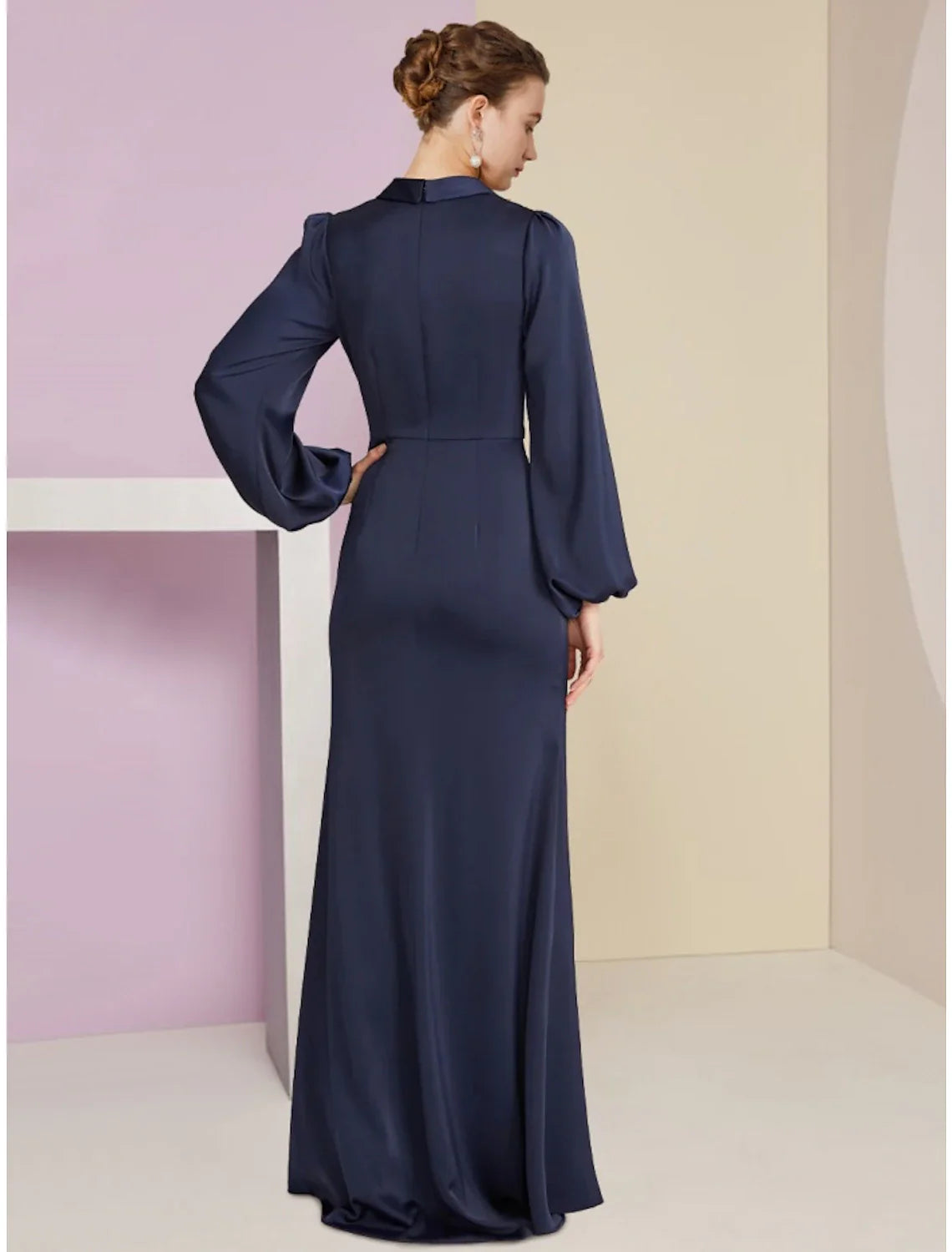 Sheath / Column Mother of the Bride Dress Wedding Guest Elegant V Neck Floor Length Stretch Satin Long Sleeve with Split Front Ruching