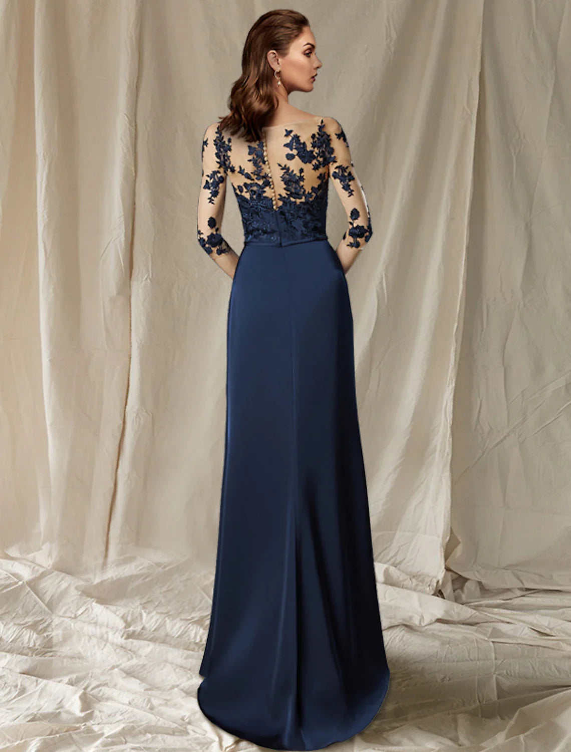 Sheath / Column Mother of the Bride Dress Wedding Guest Plus Size Elegant Jewel Neck Sweep / Brush Train Chiffon Half Sleeve with Appliques Fall