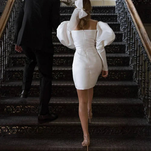 Elegant White Satin Short Wedding Dress with Puff Sleeves