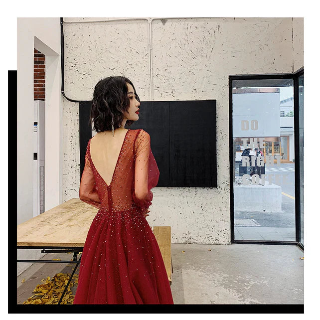 Wine Red Long Sleeves Beaded Low Back Tulle Prom Dress Formal Dress