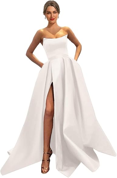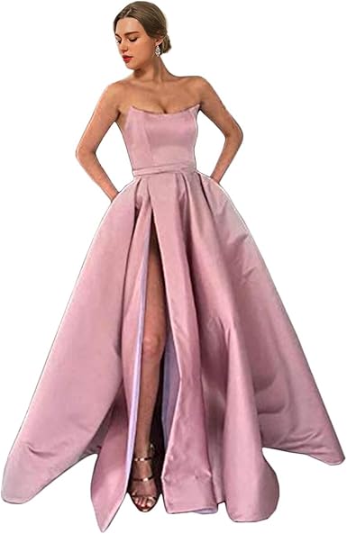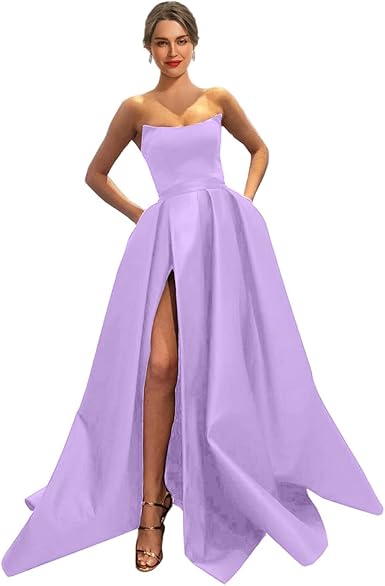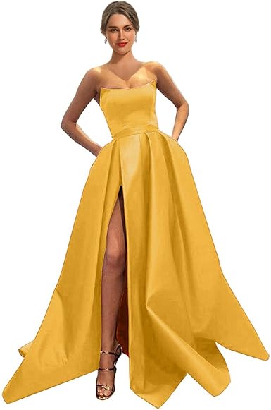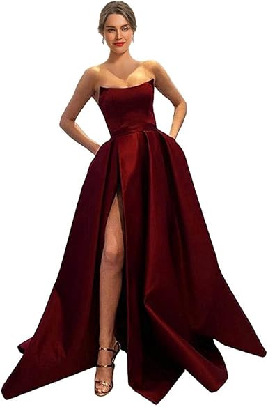 Womens Long Strapless Satin Prom Dress Sleeveless Slit Evening Ball Gown